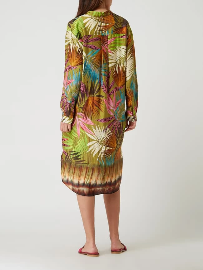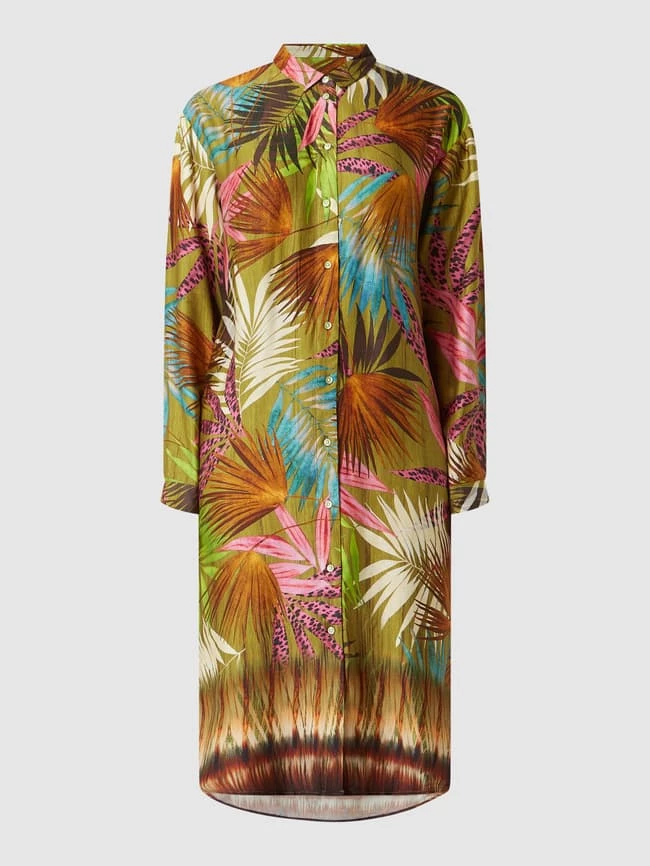 Das Hemdblusenkleid von Emily Van den Bergh ist aus reiner Viskose gefertigt. Es zeigt sich in ausgestellter Passform mit Palmen-Prints und Umlegekragen.