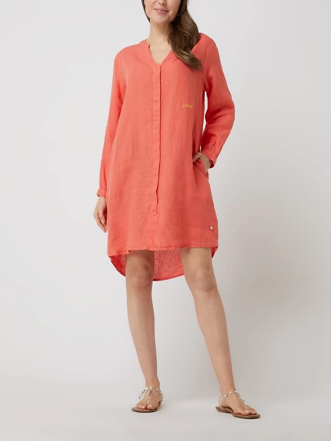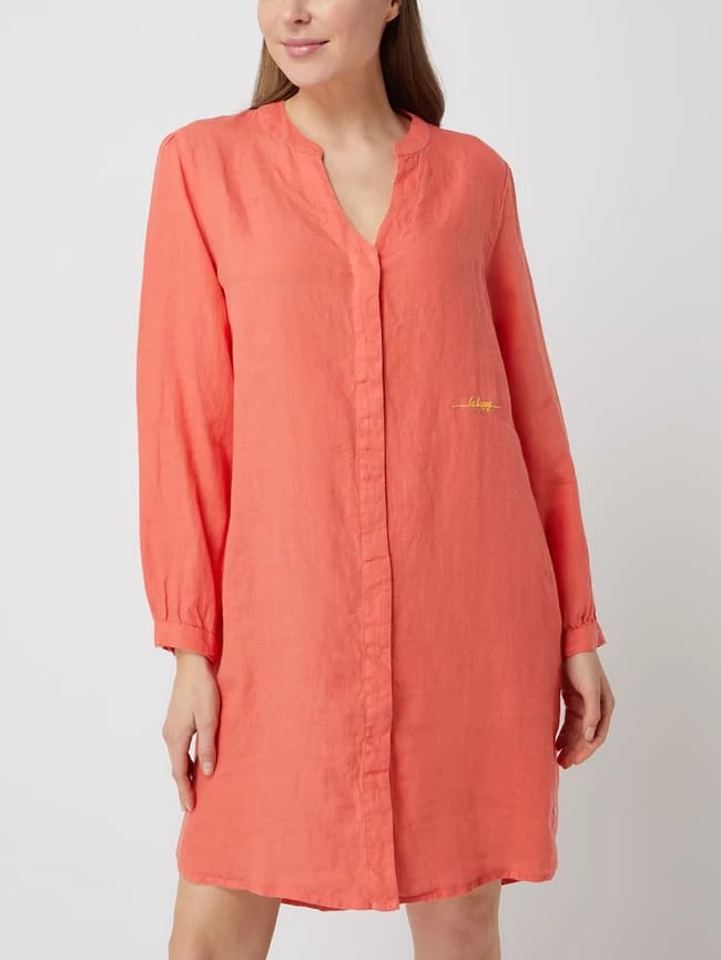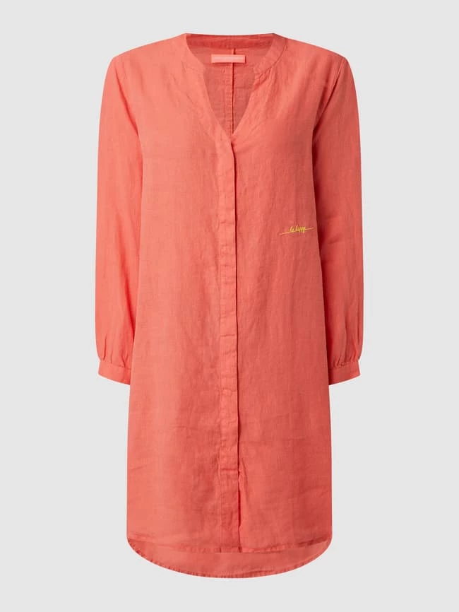 Das Blusenkleid von Frieda & Freddies ist aus reinem Leinen gefertigt und leicht ausgestellt geschnitten. Es kommt mit Tunikakragen, verdeckter Knopfleiste und Message-Stickerei.